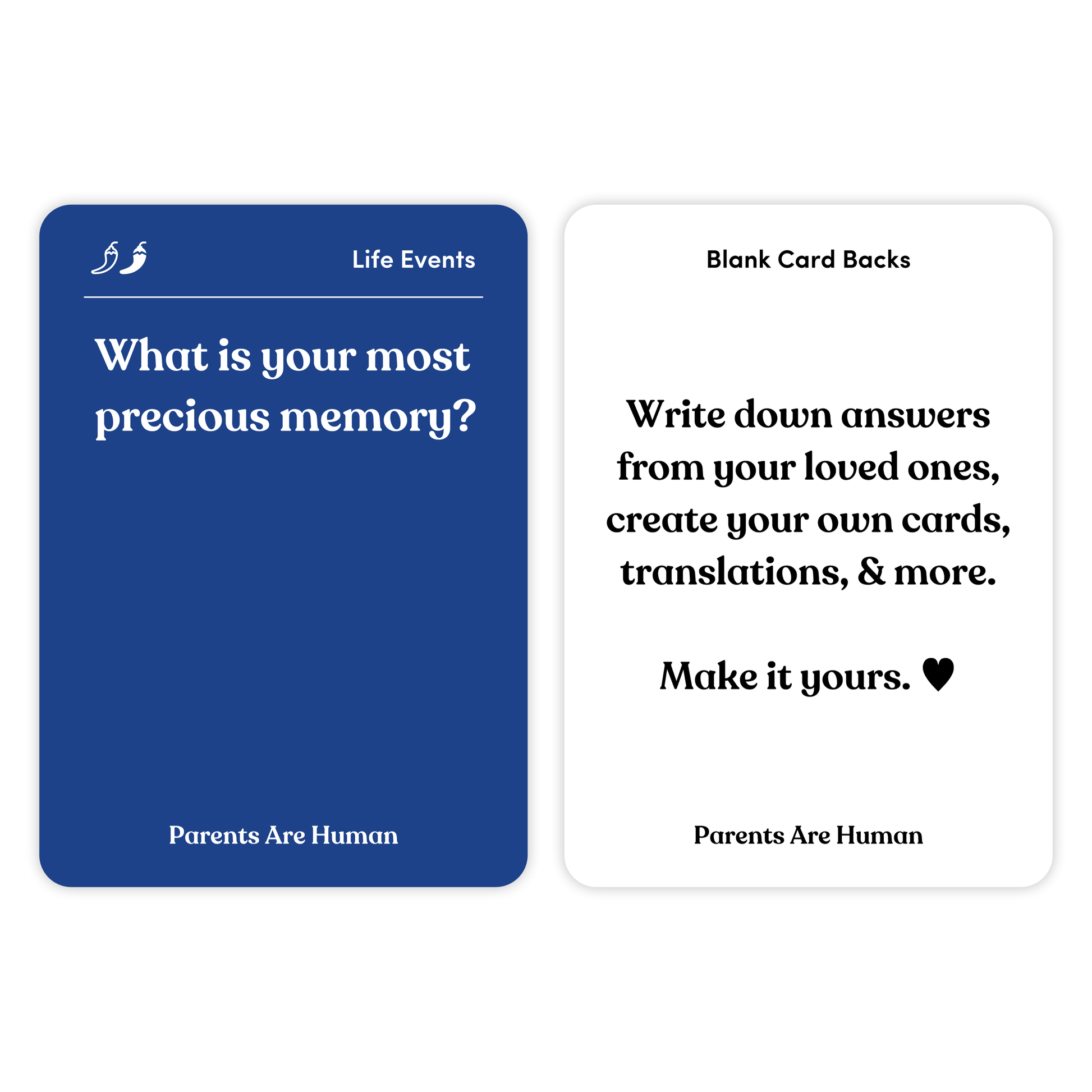 We made the backs of each card blank so you can write down answers from your loved ones, create your own questions/actions, translate them into another language, and more. Use permanent markers. Make it yours. ♥
