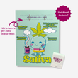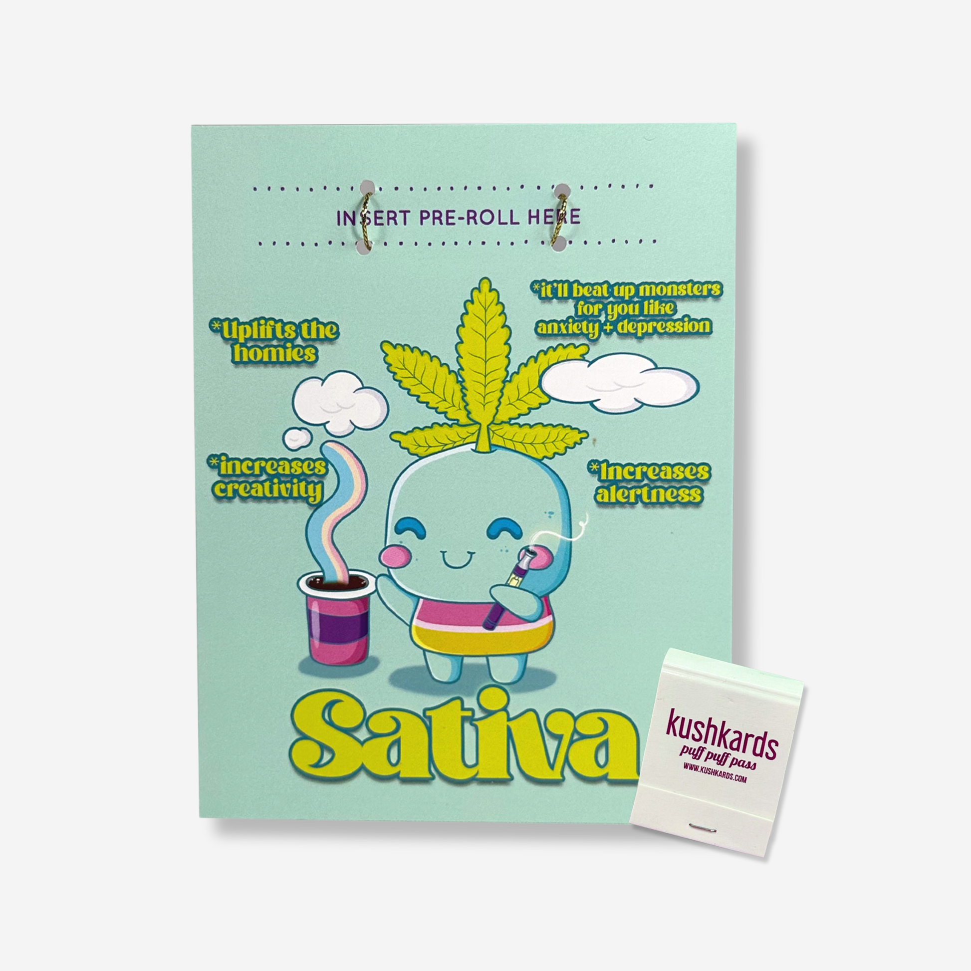 Set against a soft mint background, this card features a jolly Sativa character, symbolizing the energizing essence of Sativa strains. It's the perfect way to spark joy and inspiration in your friends' lives. The benefits of "Uplifting the Homies," "Increasing Creativity," and "Alertness" are playfully illustrated, making this card a charming guide to an elevated mood. The included matchbook adds a convenient and fun twist to this vibrant greeting.